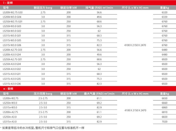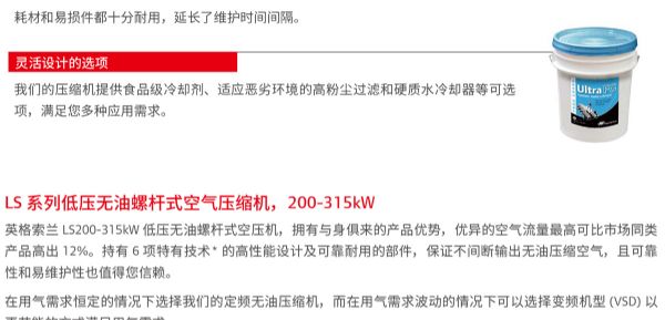產(chǎn)品名稱:LS系列200-315kW低壓無油螺桿空壓機(jī)壓力:2.5-3.0bar功率:200-315kw排氣量:49.6-82.3m3/min品牌:英格索蘭